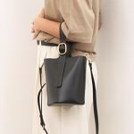 ハンドル部分のバックルがポイントのワンハンドルバッグ。光沢感を抑えた素材がきれいめカジュアルに取り入れやすい雰囲気です。