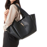 なめらかで手触りの柔らかい生地を使用したたっぷりサイズのトートバッグ。口元の差し込み錠がポイントになり高級感をプラスしてくれます。A4ファイルが入るサイズ感でありながら約400gという軽さがうれしい。