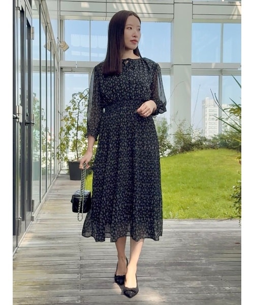 繊細な小花柄とシアー素材が軽やかさを演出するワンピース?ウエストのシャーリングが自然にメリハリを作り、スタイルアップ効果も抜群です!