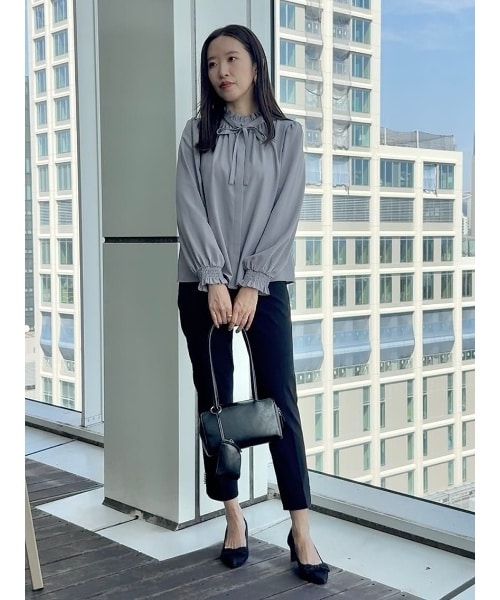 ブラックのテーパードパンツを合わせることで、甘めのブラウスを大人っぽく引き締め。細身ラインが脚を長くすっきりと見せてくれます!