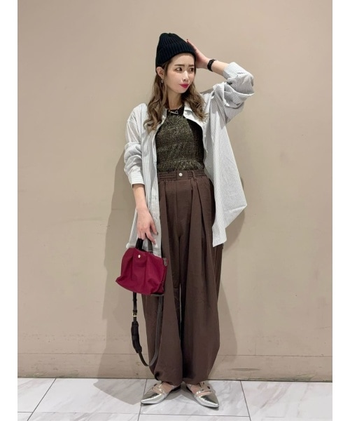 【着用サイズ タンクトップ:F シャツ:F パンツ:F】胸のワンポイント刺繍がアクセントのビッグシャツ。トラッドライクなストライプとチェックの3種類の落ち着いたカラー展開で秋ムードたっぷり◎