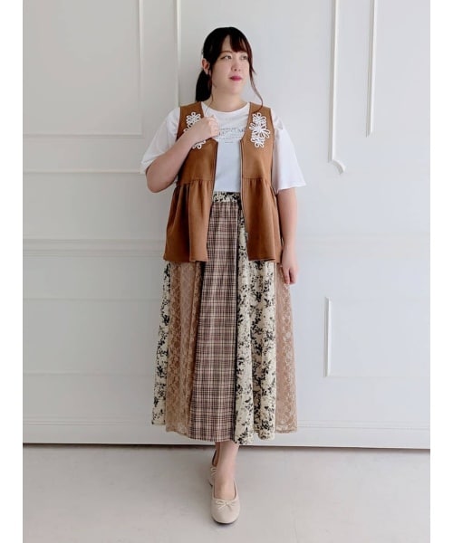 スカートはチェック柄×小花柄×レースが縦で切り替えられた華やかなデザイン♪ ウエストは総ゴムなので履き心地が楽ちん! トップスにはシンプルな白Tシャツに同系色のスエードベストを合わせて、ゆるっとしたボヘミアンライクなスタイリングに仕上げました!