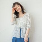 細かな花柄の前あきブラウス。可愛らしい雰囲気に合わせて明るめのパンツと合わせました。くしゅっとした生地で少し透け感があります。腰回りまである着丈で、腰の上あたりにシャーリングがあるのですっきり見えます。羽織りとしても使えるので、ワンピースの上に合わせたりしても◎