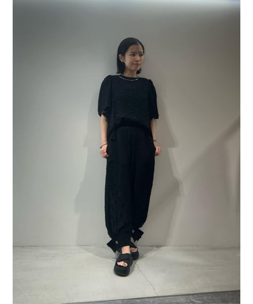 スクエアモチーフのカットジャガード素材ブラウスです。透け感があり、軽い着心地。お袖のフレアがエレガントな印象の晩夏にお勧めの一枚です。同素材パンツ(品番:531-5230806)とのセットアップ着用もおすすめです。