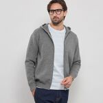 【パーカー】カンガルーポケット付きのフルジップパーカーです。ニットならではの上品な見た目と構築的なフォルムが他にはない、軽さと着心地が抜群の新感覚のパーカーです。左胸にダンディマン刺繍が入ります。