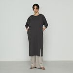 シンプル黒のワンピースに、デニムと小物を合わせてこなれたスタイリングです。