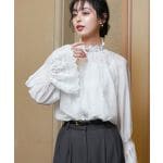 首元のオリジナルレースと袖口の刺繍が、上品なアクセントに。 インナー付きで安心して着られる、大人フェミニンな一枚。