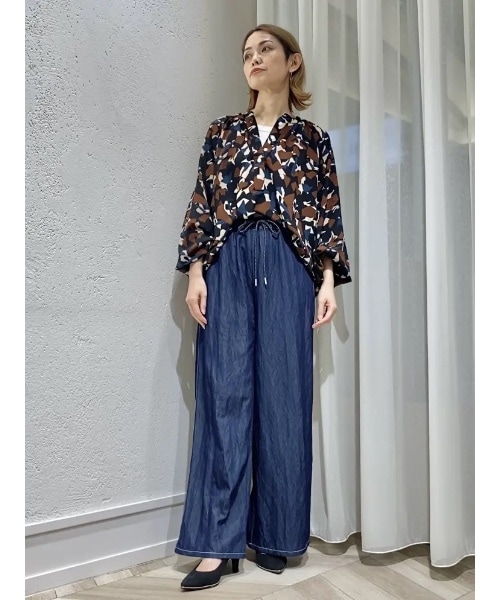 レトロな柄がかわいいヘンリーネックのブラウス! ボトムスは柄の1色を使うと合わせやすいです。