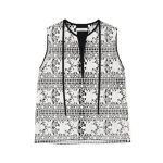 エンブロイダリーレースが華やかなノースリーブブラウス。背中の真ん中に別生地でタックのデザインがあり、後ろ姿にまでこだわった1枚。深めに入ったキーネックですっきり見え、インナーにタートルなどをレイヤードして長いシーズン着られます。