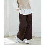秋らしいブラウンのワイドパンツはジャガード素材のプリーツ縦ラインで、すっきりスタイルアップ見えしてくれます。