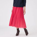 【スカート】シルエットがきれいなプリーツスカートです。トレンドのシアー素材を使ったプリーツスカートです。艶やかな素材で発色が良く、コーディネートのアクセントにぴったりです。ウエストは全ゴム仕様で、着脱も簡単です。オールシーズン着用可。