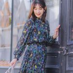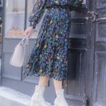 でちょうどよいサイズ感。襟と袖のシャーリングも窮屈感なく着られます。スカートは後ろウエストがゴムで脱ぎ着しやすい◎丈感は156cmで膝と足首の間くらい。タックの入ったデザインで程よいボリューム感です。