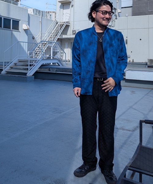 ムラ柄プリントの楊柳素材のシャツでのコーデ。 楊柳独特の自然なたるみがやわらかな印象に 吸水速乾性に優れまだ暑い今からでも サラっと羽織れる万能シャツです。