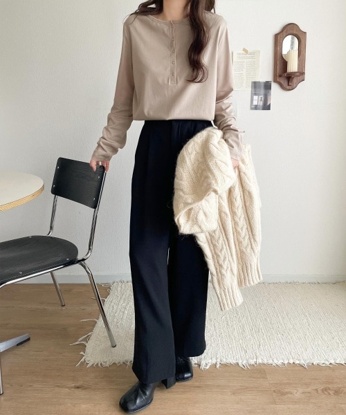 ベーシックなデザインなので、合わせるボトムス次第で カジュアルからきれいめまで自由自在に楽しめるのが魅力の優秀アイテム! テーパードパンツと合わせてきれいめオフィスカジュアルに。 デニムやカーゴパンツでラフに着崩しても◎