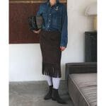 ◯スカート フリンジデザインが可愛いスカート。 長めのフリンジなのでしっかり動きがでて存在感たっぷりです! 丈はミディ丈で、一枚ではくのはもちろん、パンツとのレイヤードスタイルにもおすすめです◎