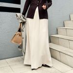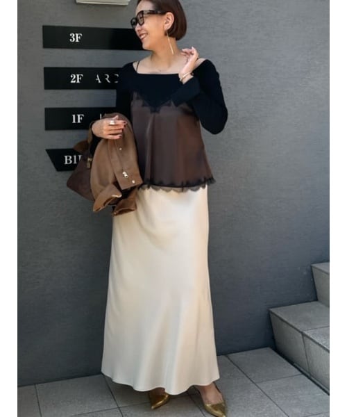 鎖骨美人ニットとレースキャミのレイヤードコーデ