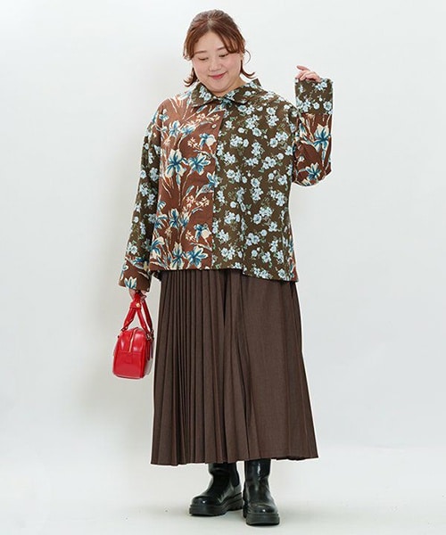 ブラウンで統一した秋コーデ!少し大きめの花柄に落ちついたブラウンの柄シャツと細めのプリーツロングスカートが可愛らしくも大人のキレイめスタイルに。暗くなりがちな秋コーデには差し色の小物を加えるとパッと明るい印象に◎