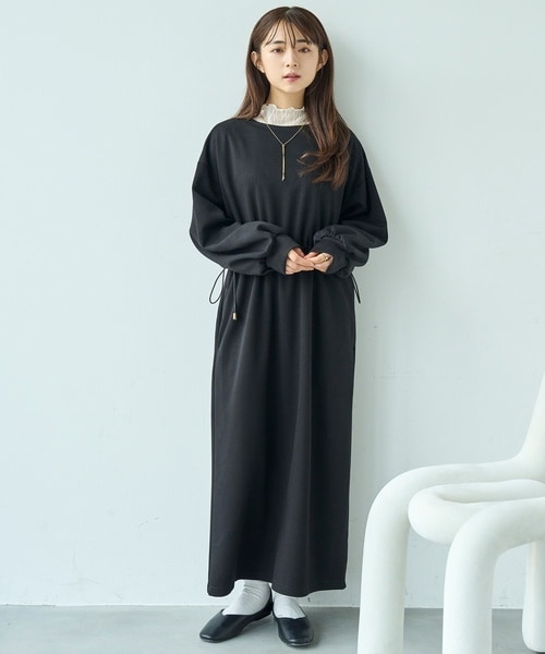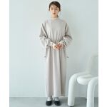 ダンボールニット素材のウエストドロストワンピースに、ウェーブ柄のシアートップスをレイヤードした旬のスタイル。立体的な質感と抜け感が顔周りを華やかにし、ドロストでメリハリをつけることでシルエットも自在にアレンジ可能。楽なのにきちんと見え、大人上品なレイヤードコーデです。