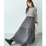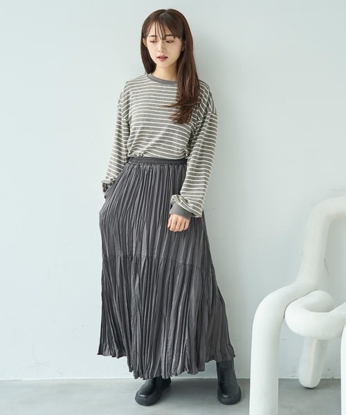 落ち着いたグレーのボーダートップスに、上品な光沢と表情が魅力のワッシャーサテンスカートを合わせた大人カジュアルコーデ。全体をグレートーンでまとめることで、こなれ感と品の良さを両立。軽やかな素材感とブーツのバランスが秋のデイリースタイルにぴったりの一着です。