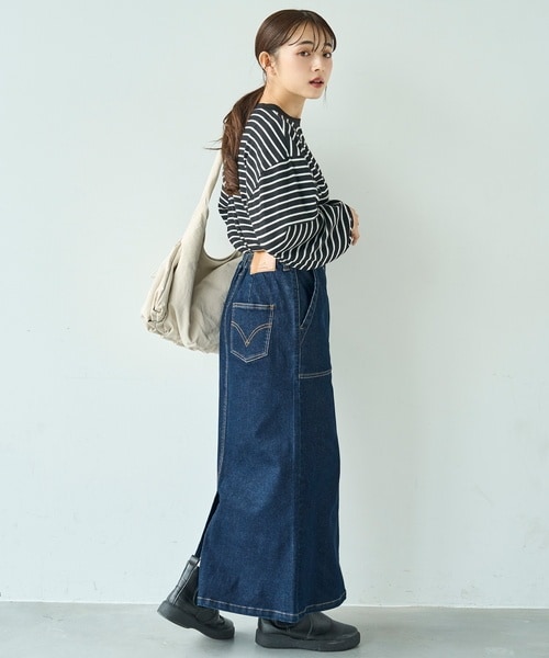 ブラック×ホワイトのボーダートップスにすっきりとしたデニムナロースカートを合わせた秋の大人カジュアル。秋のお出かけが楽しみになるコーデ。ゆったりした袖とタイトなスカートのバランスが女性らしさを引き立て、季節感のある洗練スタイルに仕上げました。