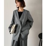 すっきりと開いたネックラインと、縦に並ぶ3段ボタンがポイントのノーカラージャケット。