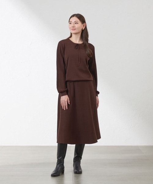 【トップス】裾はリブですっきりさせた一枚で着映えするデザインです。ソフトで優しい風合いの再生繊維(セルロース)に伸縮性のあるポリエステルを撚糸した、軽量感とドレープ性が特長です。【スカート】ミラノリブのフレアラインがきれいなスカートです。ウエストはゴム仕様で楽に着用いただけます。