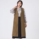 上下オープンファスナーのフェイクスエードのジレです。前を開けて羽織るだけでなく、ボタンを留めてワンピース風にも着用していただけます。ストレッチ性もあり、快適な着心地です。
