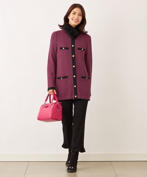 ノーカラーで配色使いが映える、千鳥柄のミドル丈ニットカーディガン。ニット部分には、レーヨン・ナイロンのストレッチ素材を使用。素材本来のキックバック性により、程よいフィット感と快適な着心地を実現しています。