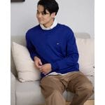 ネイビーの中綿キルトジャケットに、鮮やかなオレンジのウールクルーネックニットを合わせたスタイリング。落ち着いた色味のアウターに暖色の差し色を効かせることで、秋冬らしい季節感と華やかさを両立。