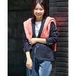 カジュアルながらもきちんと感のある大人ジャケットスタイル。 ネイビージャケットにレッドのニットを肩掛けして、差し色で明るさとこなれ感をプラス。リラックス感と上品さを両立させています。