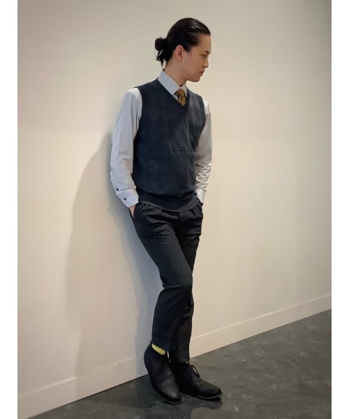 モノトーンをベースとしたコーデ。 ネクタイはソックスの色と合わせて抜け感を作った外しテクに。 コーデに柔らかさを加えたことで、気軽に話せそうな雰囲気あるスタイリングにしました。