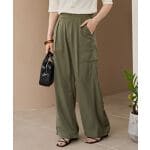 【着用サイズ トップス:M パンツ:M】光沢感のあるサテン生地のカーゴパンツ。シンプルなトップスと合わせても映える、主役級のボトムスです。