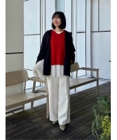 ショート丈で、タイトめシルエットのカーディガンワンピースやスカートにも◎前をしめて1枚着でも!トップスはタイトめシルエット。肩のラインの細見えが叶います♪お腹周りのタックがスッキリ見せてくれるワイドパンツは通常サイズより丈が長く感じました。
