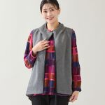 【大きいサイズ】ポップな柄インナーにベストを羽織ったレイヤードススタイル。脱ぎ着しやすいベストは寒暖差のある季節に重宝します。