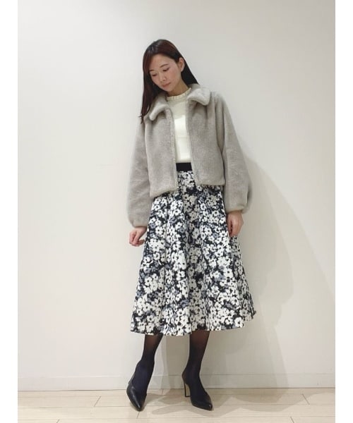 コーディネートを格上げしてくれるような、なめらかな手触りと上品な色合いが特徴のフェイクファーブルゾンです。着心地の良い軽さもポイントです。スカートはハリ感があり華やかなシルエットなのでシンプルなニットと合わせてみました。