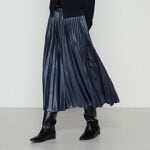 Aラインのアンゴラウールコートとサテンプリーツスカートのフェミニンなコーディネートです。
