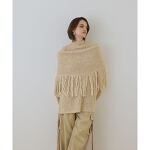 取り外し可能なフリンジケープを付けたニットトップス。ケープは襟口がゆったりしているので後ろに抜けるようなシルエットで着ていただけます。ハイネックでやや長めの丈感がモード感もあり、甘くなりすぎない大人のニットです。