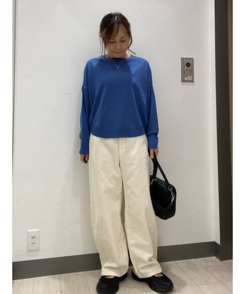綺麗なブルーのセーターに、アイボリーのコーデュロイカーブパンツを合わせて爽やかに! 裾部分のコクーンフォルムが可愛いセーターです。 寒くなっても、コートのインナーに着てもブルーが差し色になって可愛いです!