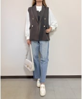 ふんわりしたワンピースドレスにオーバーサイズのテーラードジャケットを合わせて、抜け感のあるパーティースタイル。