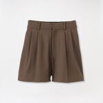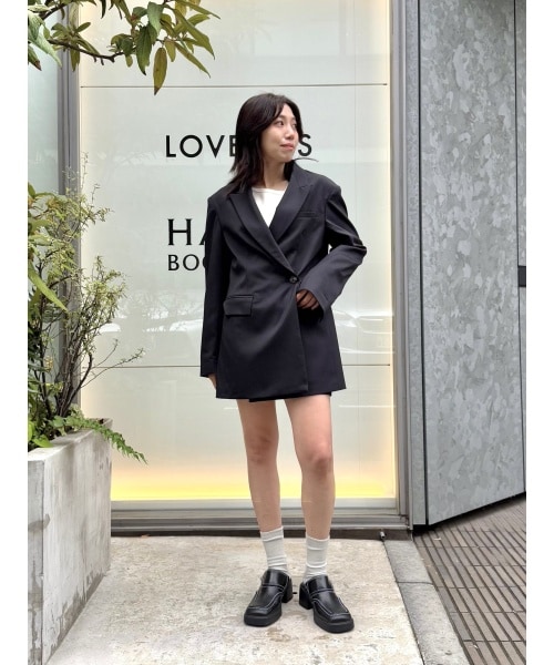 オーバージャケットをワンピース風に着用しました。外側のフロントボタンを使って、くびれができるシルエットに。インナーに着用したニットはお好みの位置でボタンの開け方に変化をつけてコーディネートが楽しめる一着です。形がきれいなショートパンツは、大人が着られる丈感が◎