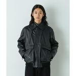 無骨なレザージャケットをインナーのニットとクリーンなホワイトパンツで和らげたコーディネート