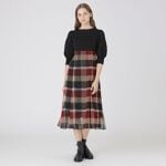 ニットとオリジナルチェックのシフォン生地をドッキングさせたドレスです。ニット部分は、編地変化で表情豊かに仕上げました。歩くたびにふわりと揺れるシルエットが目を引く華やかなドレスです。