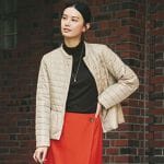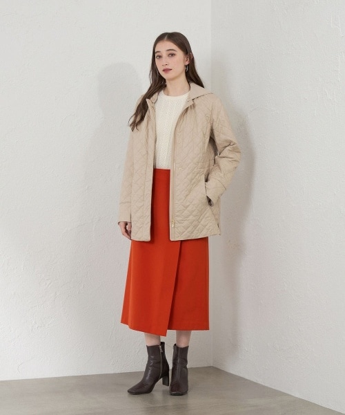 取り外し可能なフードを外すとノーカラーになるミディアムレングスのスタンダードなキルトコートです。シルエットはヒップが隠れる丈のストレートライン。ウエスト内側のコードを絞るとコーディネートに合わせたシルエットアレンジを楽しめる仕様になっております。ショート丈の展開もございます。