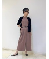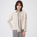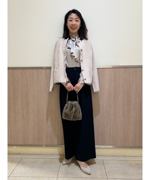 パンツは保湿性が高いことから美容製品に多く使われるアルガンオイルを配合したストレッチ素材を使用。しなやかライン、しっとりとした肌触りでオススメの1着です。ブラウスはリボンの取り外しができます。定番のニットジャケットを合わせて、華やかさのあるかたくなりすぎないコーディネートです。