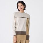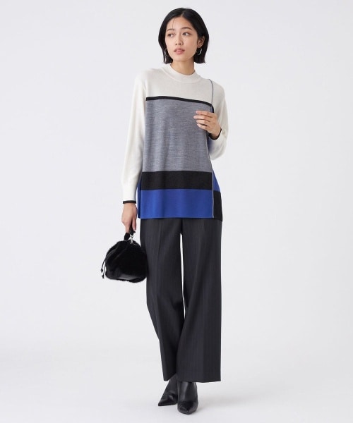 配色デザインが魅力的なモックネックのカラーブロックニットプルオーバーです。絶妙に計算され配置された大胆なブロック柄で、モードな雰囲気に仕上げています。腰周りまで隠れる真っ直ぐなシルエットで暖かく、縦に入る細いラメ糸入りのラインでスタイルアップ効果もあります。