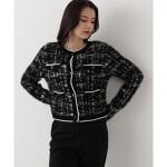 柔らかく温かみのあるツイード調のニットジャケット。裏地が無く、軽い着心地です。敏感肌のスタッフが首周りや肩、腕部分の肌が直接当たる状態で長時間着用しましたが、痛みや痒みもなく過ごせました。