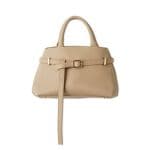 リボンのチュールデザインがポイントのニットに、ブラウンのパンツとバッグをあわせてベージュ×ブラウンでまとめたスタイリング