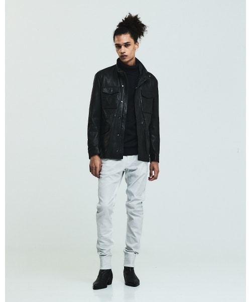 軍用ギアの最高峰M-65のレザージャケットを細身のデニムとタートルネックでスタイリッシュに
