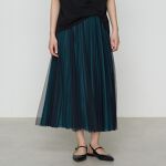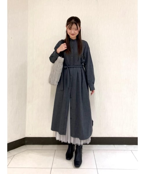 1枚で決まるシャツドレスにチュールスカートを合わせて、フェミニンなイメージをプラスしたコーディネートです。
