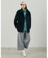 アイボリーのキルティングジャケットにパープルのボアベストを重ねた旬なレイヤード。グレーのスカートで落ち着きを添え、キャップで抜け感を出した大人カジュアルコーデ。